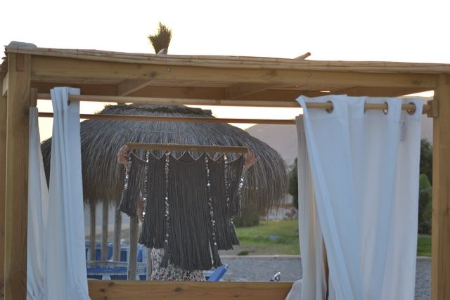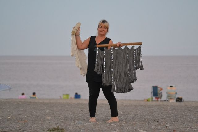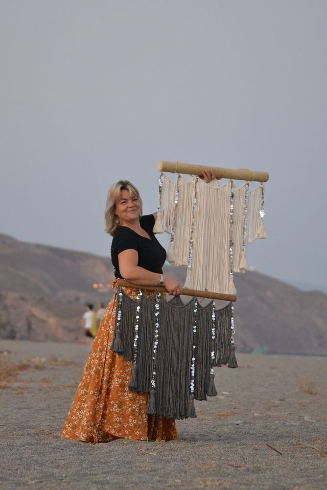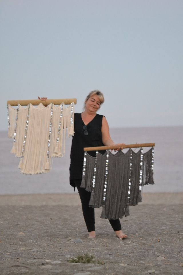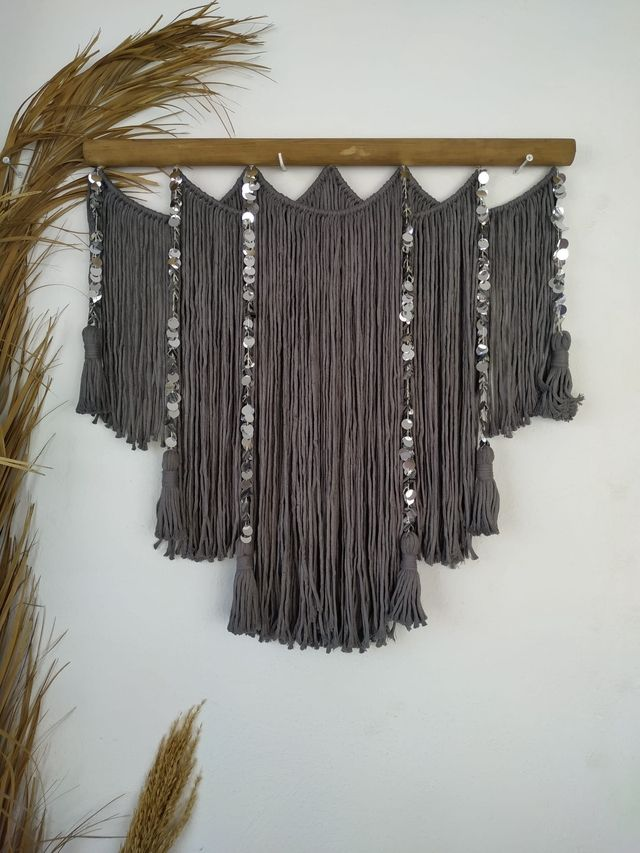 Hecho a mano en hilo de algodón gris y lentejuelas plateadas