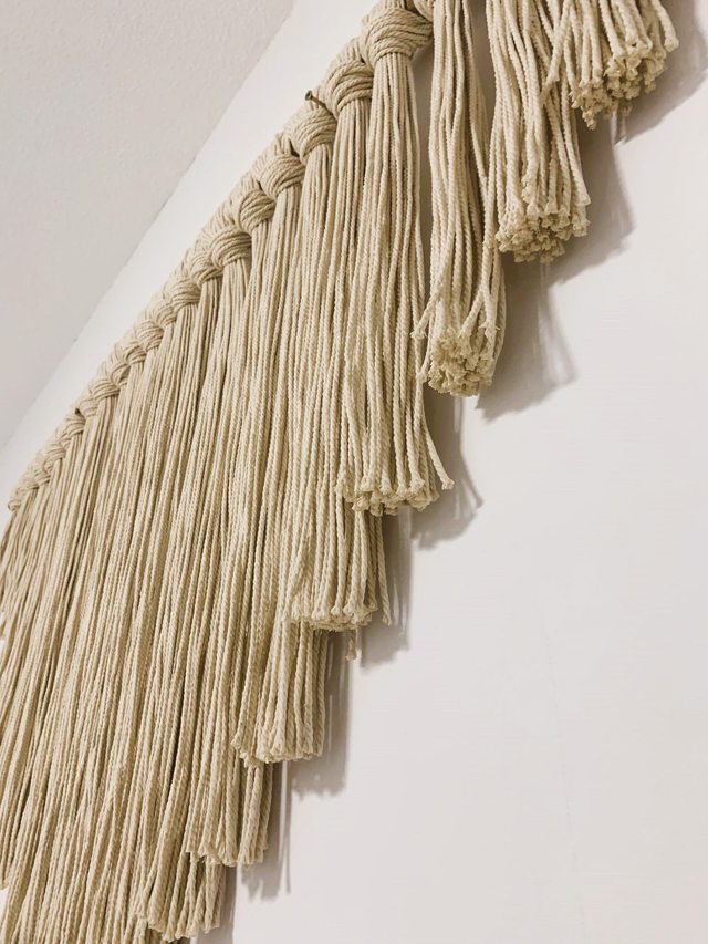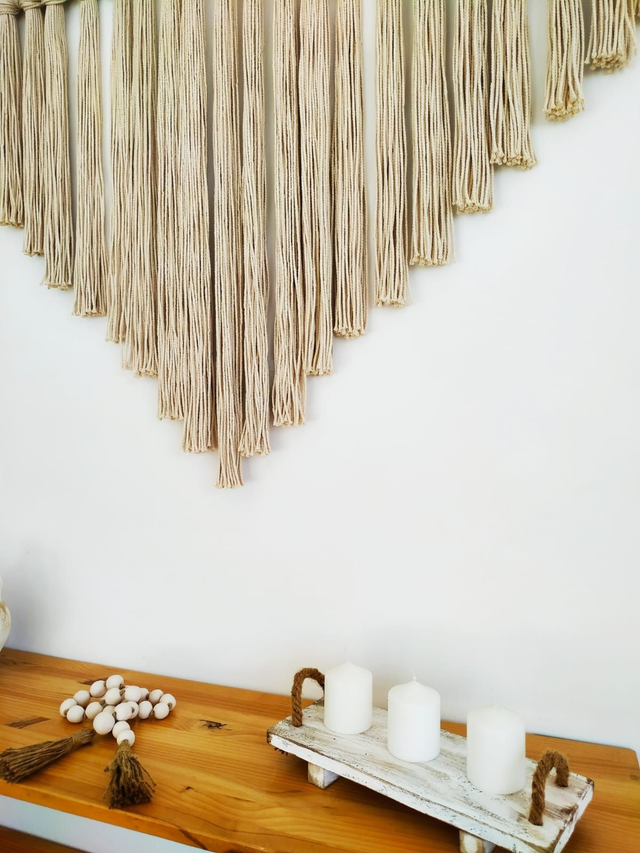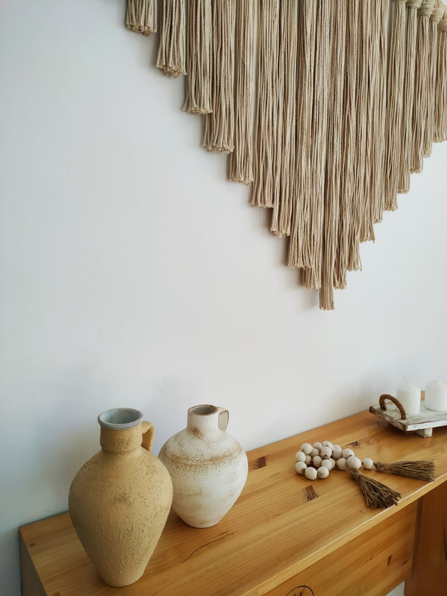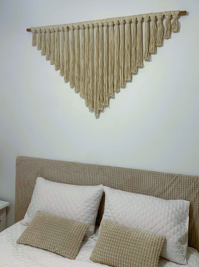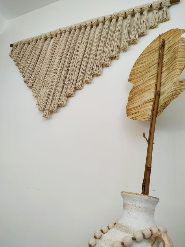 La simplicidad de su diseño, tejido con el nudo alondra sobre un palo de bambú, lo convierte en un elemento decorativo excepcionalmente elegante que complementará cualquier espacio. Su belleza reside en su minimalismo, que aportará un toque de sofisticación a tu hogar.