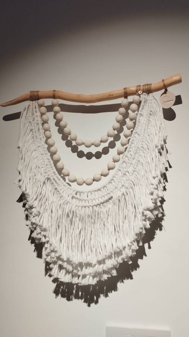 Una pieza central de nuestra aclamada colección Almas de Arcilla. Hecho a mano con hilo de algodon y cuentas de arcilla blanca. Marcada con nuestro distintivo sello de Santakana, esta pieza es la esencia pura de la tierra hecha arte.
