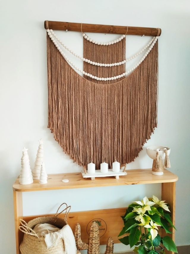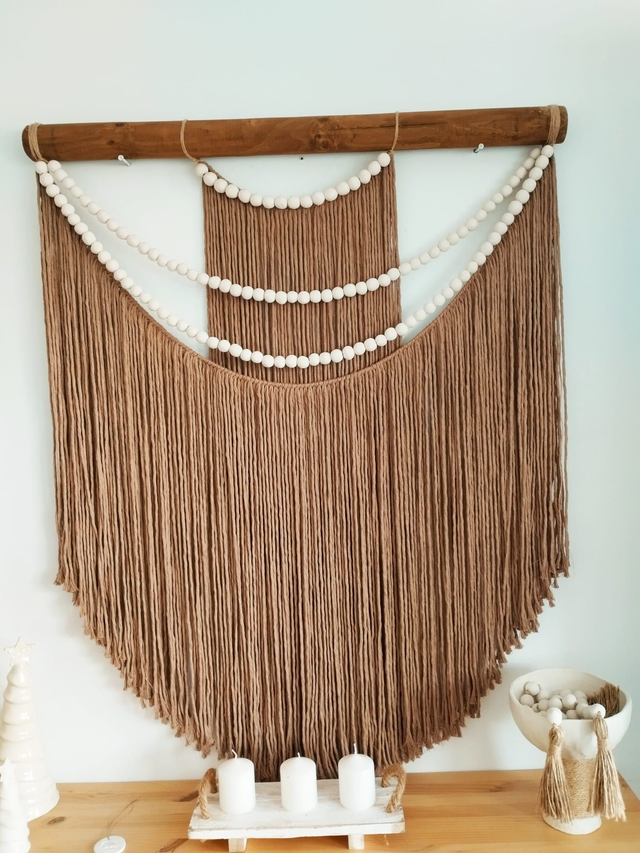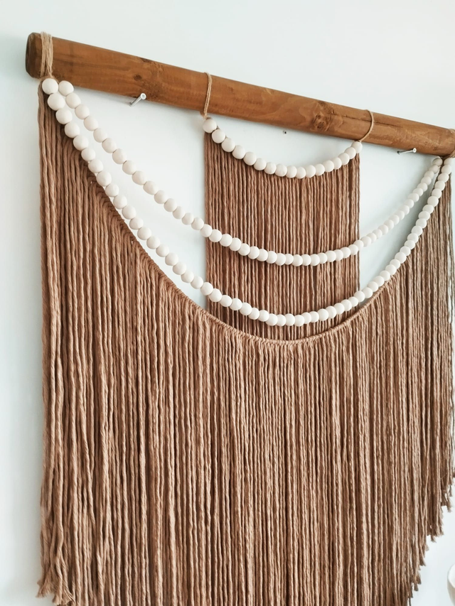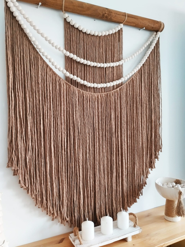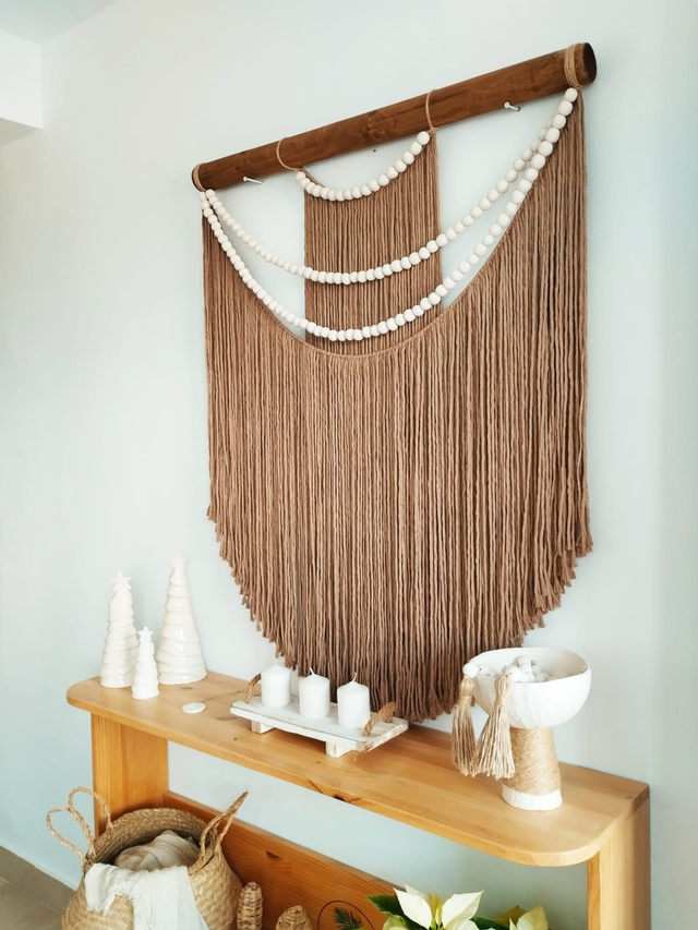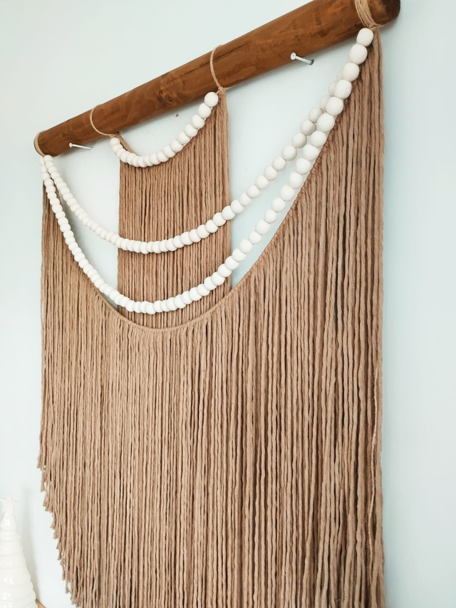 Este tapiz es muy versátil ya que puede encajar en diferentes estancias como tu recibidor, salón, dormitorio, despacho o porche. Reluce tus paredes con el tapiz Oasis al más puro estilo Escandinavo. Está fabricado con hilo de algodon tostado y bolitas de ceramica.