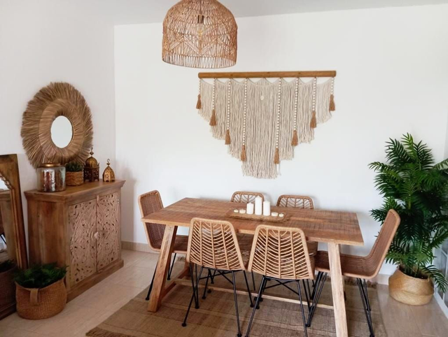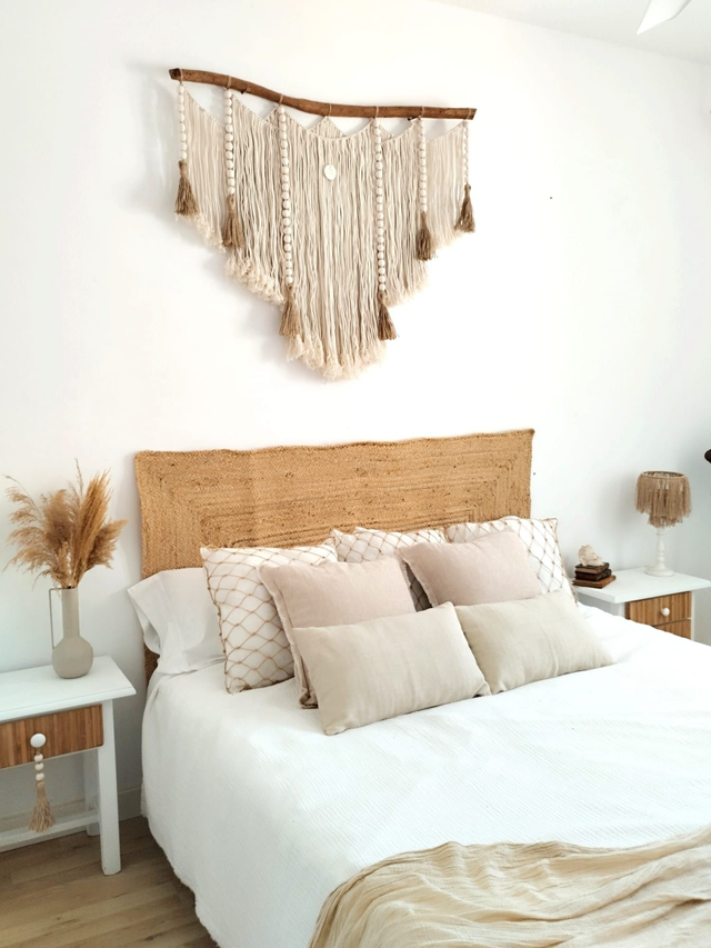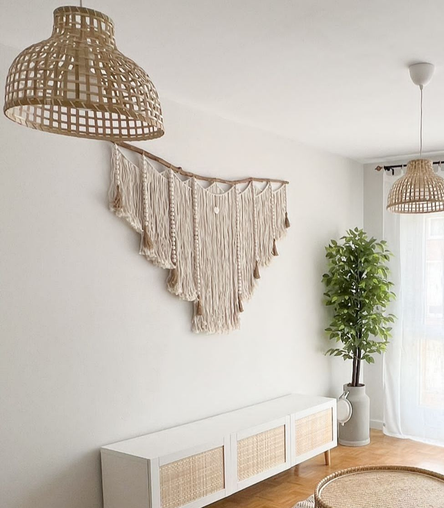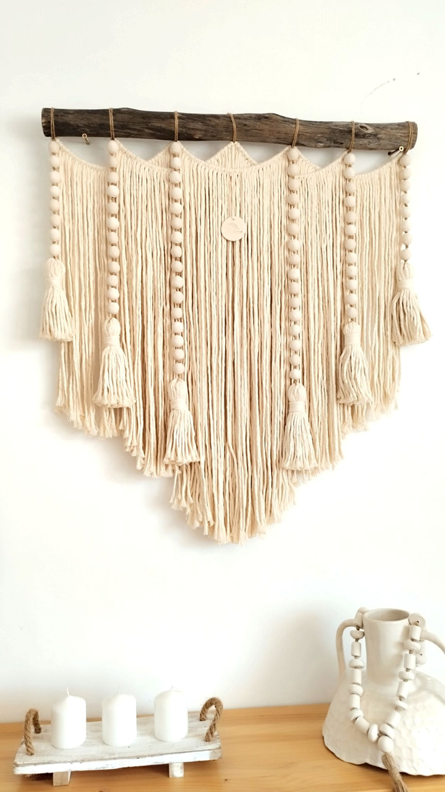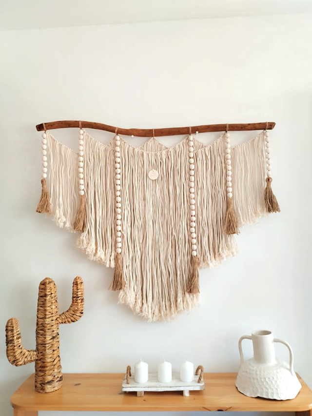 Sin duda, nuestro favorito: el Tapiz Santakana. Esta pieza única y artesanal está hecha a mano con hilo de algodón crudo y adornada con delicadas bolitas de cerámica blancas. Montado sobre un tronco de madera silvestre, cada tapiz refleja un diseño natural y auténtico que aportará calidez y estilo a cualquier espacio.