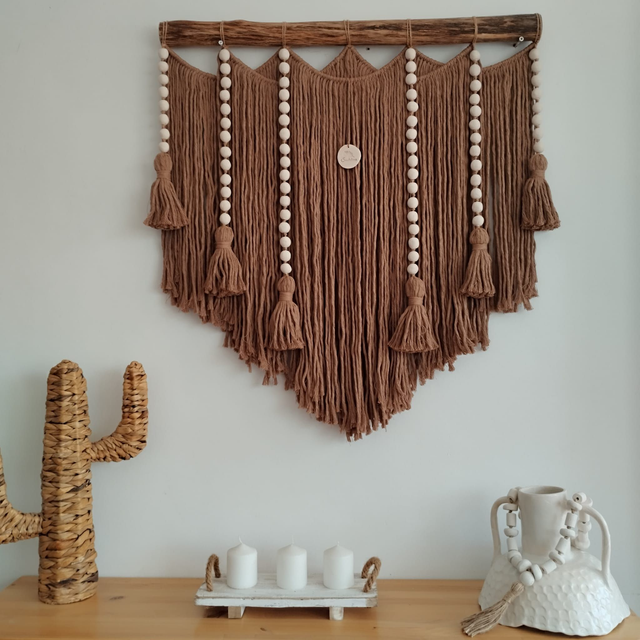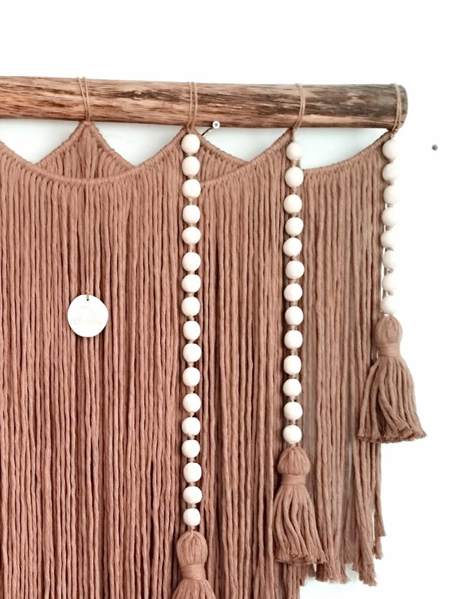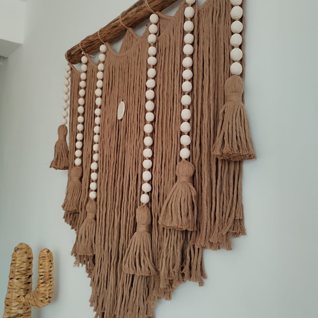 Hecho a mano en hilo de algodón tostado y bolitas de cerámica blancas.