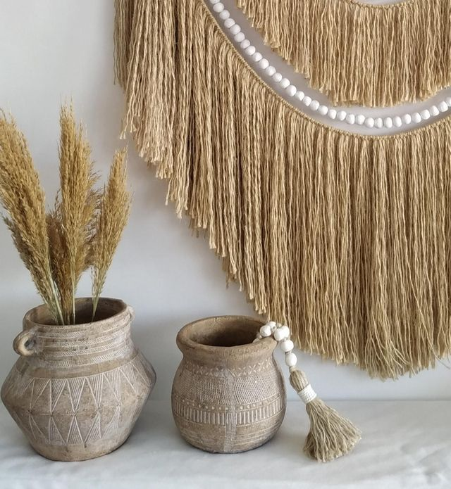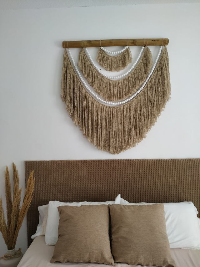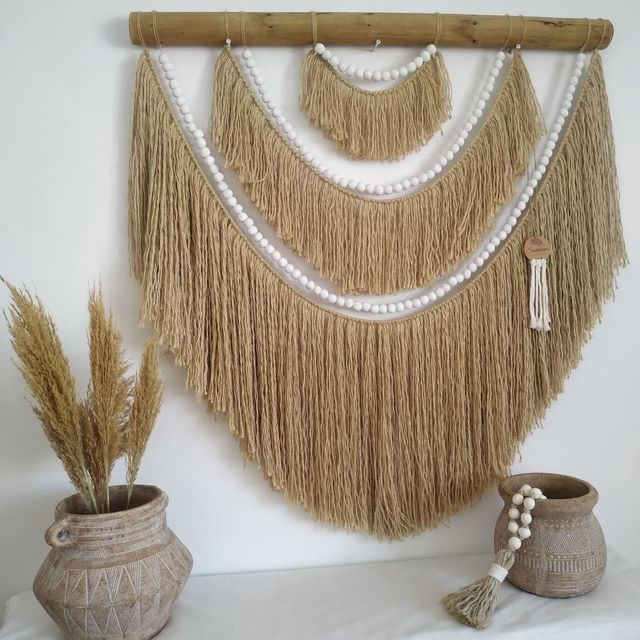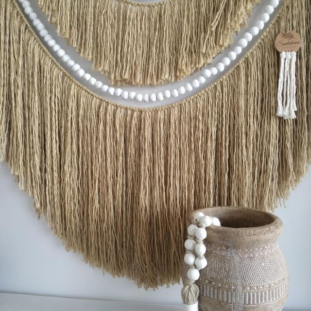 Tapiz Timanfaya Tapiz hecho a mano en hilo de algodón crudo y bolitas de cerámica blancas. La medida es ancho por largo. Deja volar tu imaginación creando un sinfín de combinaciones con la Decoración de Pared y los elementos decorativos que te ofrecemos desde Santakana. Acompáñalo con espejos, cuadros, láminas y consigue una pared llena de personalidad que atraerá todas las miradas. Este tapiz es muy versátil ya que puede encajar en diferentes estancias como tu recibidor, salón, dormitorio, despacho o porche. Reluce tus paredes con el tapiz Timanfaya al más puro estilo Escandinavo. Está fabricado mediante un trenzado de fibras naturales muy resistentes.